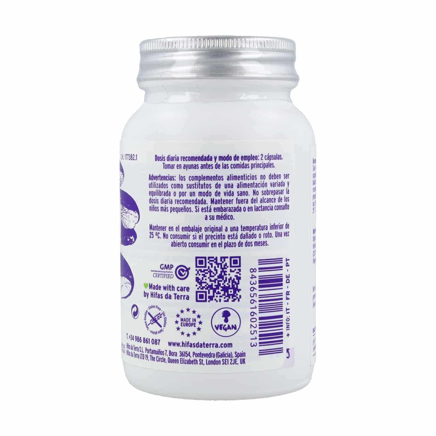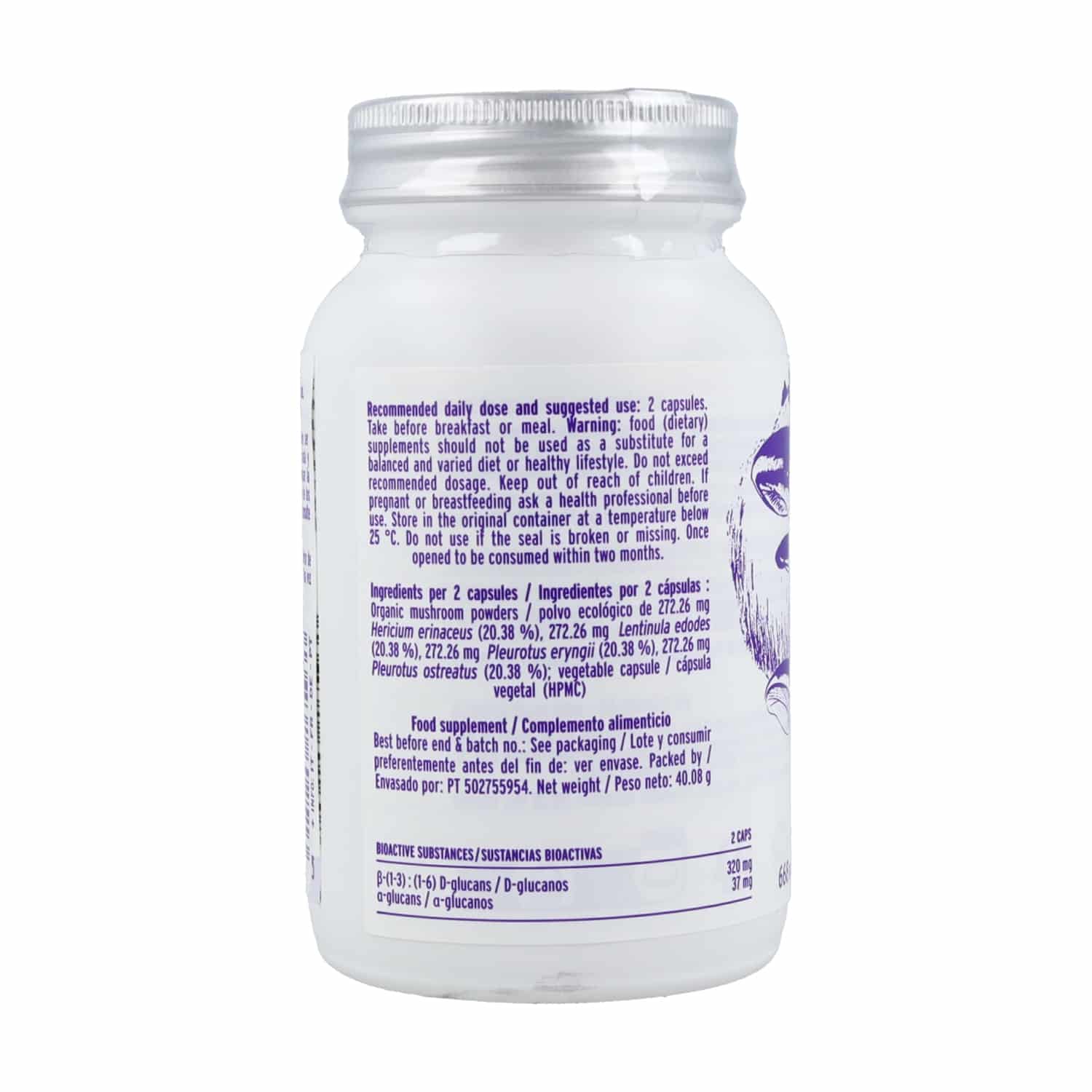 Este suplemento contiene las propiedades del polvo de Melena de león, Shiitake, Seta de ostra y Seta de cardo. Estos se hongos medicinales caracterizan por su alto contenido en fibra y su actividad prebiótica.