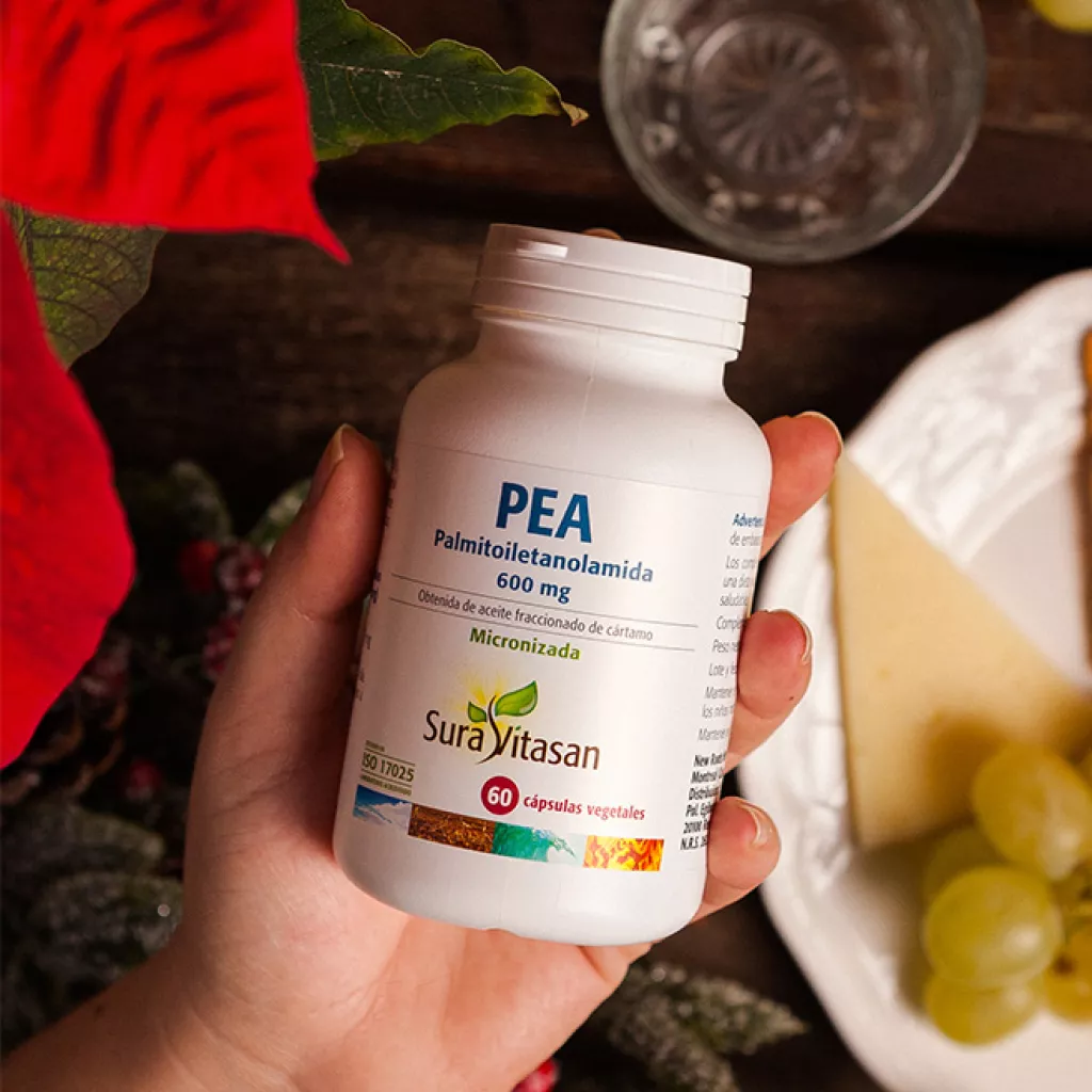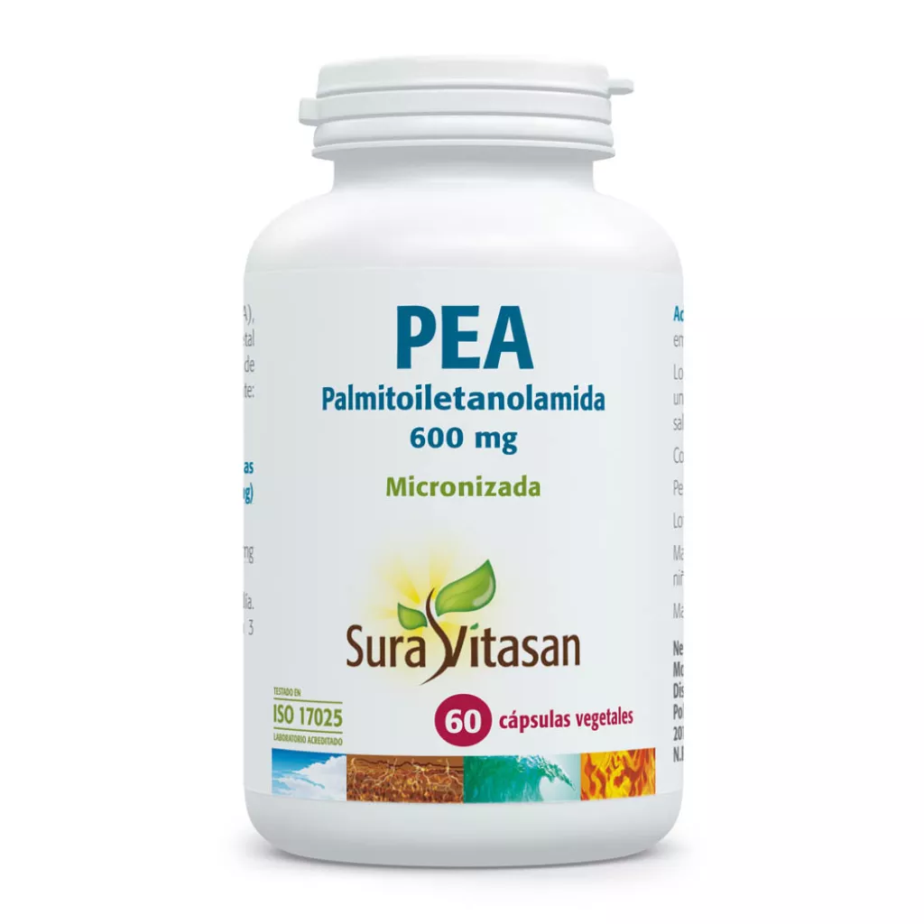 Cada cápsula de PEA de SuraVitasan contiene 600 mg de palmitoiletanolamida (PEA). La PEA es micronizada para mejorar su absorción y biodisponibilidad. La palmitoiletanolamida (PEA) es una amida de ácido graso que está presente en todo el cuerpo y se produce de forma endógena en respuesta a la lesión celular como respuesta protectora. Se identificó por primera vez en la yema de huevo, la soja y el aceite de cacahuete en la década de 1950, y más tarde se descubrió que también estaba presente en los mamíferos. No posee efectos adversos y no se han descrito interacciones con ningún medicamento.