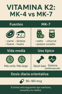 Vitamina K2: beneficios, fuentes y MK-4 vs MK-7 (guía práctica)
