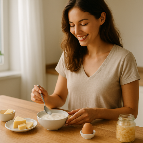 Los alimentos ricos en vitamina K2 incluyen productos lácteos con alto contenido de grasa, yemas de huevo y, como se mencionó anteriormente, alimentos probióticos. Dado que la vitamina K2 es liposoluble, no se encuentra en alimentos bajos en grasa.